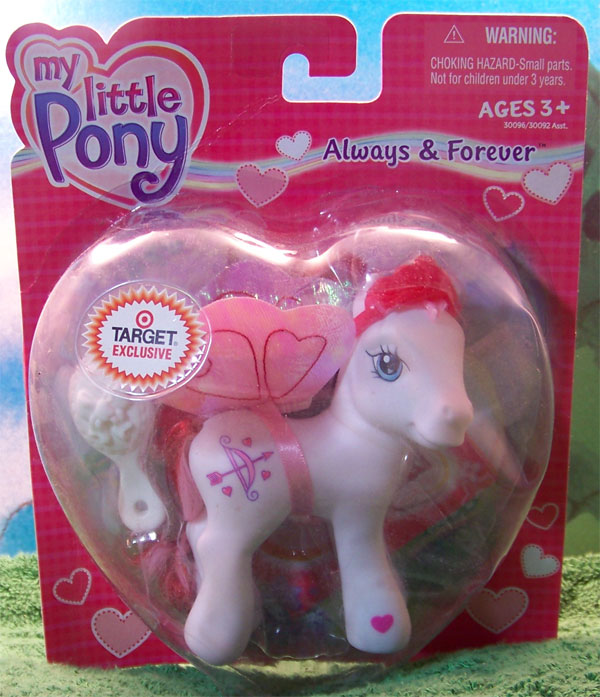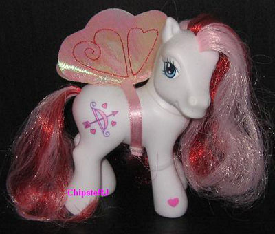 her cutie mark is a pink and purple bow and arrow with three pink hearts. |