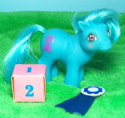 Baby Blue Ribbon came with the Adventures in Ponyland game, Peach Cardbord Die and a Blue and White prize ribbon.