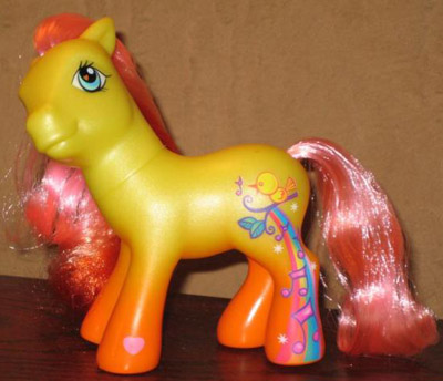 The Flutter Pony Morning Glory came with Flat Sticker, Gold Metallic Ribbon, Pink w/ Green centers